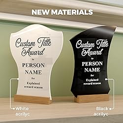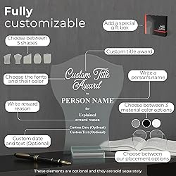 - Celebrate achievements, milestones, and moments of excellence with the EGD Custom Acrylic Trophy Award—a sophisticated and fully customizable plaque designed to elevate any employee appreciation gift, office award, or business recognition moment. Each plaque is crafted from premium acrylic in your choice of Clear, White, or Black finish, with laser-engraved text that you personalize with the award title, recipient's name, recognition reason, date, and even additional message. Whether it’s for an Employee of the Month, team milestone, leadership recognition, or a thank-you for outstanding service—this plaque turns your sentiment into a lasting memory. Customize your award completely: - Choose from 5 professional shapes (Shield, Oval, Cup, Wavy Pillar, Slanted Pillar) - Pick text font and color (white or black) - Select from multiple base options: wood, clear acrylic, black acrylic, or LED bases (only for clear plaques), and wood, clear acrylic, black acrylic bases (only for black or white plaques) - Optional gift box available for an elevated unboxing experience The dimensions are a standard 8" wide by 10" high, making this piece a prominent yet elegant presence on any desk or shelf. Designed and manufactured in the United States, each plaque is made from non-toxic materials and printed using environmentally responsible inks for a polished, sustainable finish. Ideal for businesses looking to strengthen team spirit, express gratitude, and recognize hard work in a meaningful way. Whether you're buying one or ordering in bulk for your team, this trophy is a memorable way to say Thank You or Congratulations. teacher appreciation gifts, teacher appreciation, employee of the month, appreciation gifts, employee appreciation gifts, trophy, employee appreciation gifts bulk, awards, trophy award, thank you gift, award, soccer trophy, staff appreciation gifts, medical assistant gifts, trophies, awards and trophies, coworker gifts, custom plaque, plaque, custom picture, nfl football, award plaque, custom trophy, team gifts for employees, fantasy football trophy, congratulations gift, appreciation gift, custom photo, soccer trophies, employee appreciation decorations, employee appreciation, basketball trophy, personalized plaque, school staff appreciation gifts, work anniversary gifts, leadership gifts, employee gifts, trophies for adults, para appreciation gifts, employee of the month plaque, trophy cup, staff appreciation, boss gifts men, football trophy, teacher appreciation plaque, small trophy, football decor, employee appreciation gift, team appreciation gifts, st place trophy, acrylic plaque, customizable trophy, custom award, acrylic award, plaque award, custom awards, personalized award, thank you award, custom trophy plaque, award plaques personalized, fantasy football trophy customizable, acrylic trophy award, employee appreciation awards, trophies and awards customized, employee recognition trophy, trophy plaques, dax award plaque, yearly award plaque, thank you awards, blank acrylic awards, principals award, customized award, appreciation trophy
