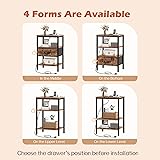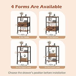 【Night Stand with Charger Station】: 1 USB port, 2 AC outlets, and 1 USB-C port are on the nightstand for bedrooms. Imagine plugging in your lamp, phone or watch before sleep, power is just within your reach, then be happy to greet the morning with fully charged devices 【Fabric Drawer Install Up or Down】: 2 install positions of the drawer are available, you can install it for needed storage heights. 3 storage shelves and 1 fabric drawer on the bedside table are surely enough to store various items 【Storage Helper in Many Spaces】: Granted, it's a clutter-free side table with drawer for your books, cups..., but not only that, it can prop up your coffee, books beside the sofa or even as a storage rack in the living room or dorm. Plus: Adjustable feet will make it stable in any place 【Go for a Long Time】: Vintage wooden grain shelves blend black fabric and metal frame, making it a timeless classic. Sturdy P2 particle board, sturdy metal frame, and durable fabric drawer, all these work excellently to give this side table with charging station strong support 【Help to Assemble】: No complicated steps, with instruction, numbered components and tools, this tall end table will be finished quickly