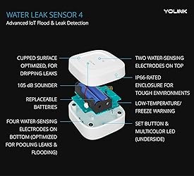 No WiFi Worries: Say goodbye to WiFi dependency! YoLink devices use industrial-grade LoRa protocol for communication, offering an impressive ¼ mile open air range. They don't connect to your network or the internet; they communicate securely with the Hub (Hub not included!). Enjoy obstruction-penetrating, long-range coverage without compromising your privacy. Effortless Installation: Set it and forget it! Installing the YoLink wireless Water Sensor takes seconds. Simply place it near or under the equipment you want to monitor. Perfect for toilets, water heaters, laundry machines, dishwashers, sinks, fish tanks, sump pumps, and any other water-prone areas. Extreme Long Range: Powered by LoRa technology, our system offers the industry's longest receiving range (1/4 mile). Overcome WiFi limitations and monitor areas like basements, outdoor spaces, sheds, garages, and remote outbuildings with ease. Powerful 105dB Audio Alarm: Be instantly alerted to potential leaks with our water leak detector's robust 105dB audio alarm. Swiftly respond to emergencies and protect your space from water damage. IP66 Waterproof Protection: Designed to endure various conditions, our water leak detector boasts an impressive IP66 waterproof rating. Count on its reliability indoors. Built-in Freeze Warning: Equipped with a low temperature sensor, the Yolink Water Leak Sensor not only detects leaks but also alerts you when the temperature drops to freezing levels, helping you prevent frozen pipes and potential damage during colder months. Start Smart: A YoLink hub is your gateway to full functionality. Connect with a growing range of smart home and business products. Find our SpeakerHub (B0BZBYD1MK or B09FSS95G9 for audio capabilities) or the original Hub (B08CBTTD17 or B07TQLKQLJ). Batteries Included: Enjoy peace of mind for over 5 years with two replaceable AAA batteries included. No need to worry about frequent replacements.