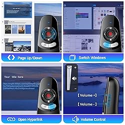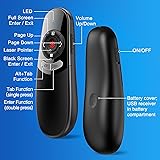 【Dual Connectors Presentation Remote】The wireless slide clicker features both USB-A and USB-C connections, allowing it to connect to different types of computers. The receiver is conveniently stored next to the battery compartment, making it easy to carry. (Note: 2 AAA batteries are required but not included) 【Multi-featured Presentation Pointer】Usb powerpoint remote control offers all the essential functions like page forward/backward and full/black screen. Additionally, it includes extra features such as volume control, hyperlink activation, and window switching. With these capabilities, you can effortlessly present and control your computer 【Long Control Wireless Range】Enjoy a maximum wireless control range of 164FT. This allows you to freely move around the room without any limitations from your computer, ensuring a seamless presentation experience 【Easy to use】The wireless clicker for PowerPoint presentations is plug-and-play, requiring no software installation. It is comfortable to hold with its ergonomic and compact design, making it an easy-to-use presentation tool for all your basic needs. Whether you're a student, teacher, or business professional, this clicker will help make your presentations more engaging 【Wide Compatibility】The slide pointer for presentation is compatible with various operating systems including Windows 2003/XP/Vista/7/8/10 or above, Mac OS, Linux, and Android. It also supports popular software such as PowerPoint, Excel, Prezi, Google Slides, iWork (Keynote & Numbers & Pages), and websites