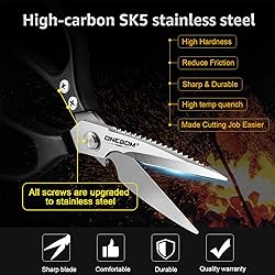 - Introducing the ONEBOM Kitchen Scissors – the ultimate heavy-duty multipurpose scissors that will transform your kitchen experience! With its sturdy construction and sharp blades, these stainless-steel scissors make preparing food a breeze. Whether you need to slice through poultry, seafood, or vegetables, these utility scissors can handle it all. With its precision cutting abilities, these kitchen shears scissors can be used for meat cutting scissors, vegetable scissors, or even large scissors for everyday use around the home. The ONEBOM Kitchen Scissors are more than just your average kitchen scissors. The poultry shears heavy duty design ensures you can easily cut through any meat, chicken scissors or chicken shears with ease and precision. These sharp scissors heavy duty and multipurpose scissors are a must-have in any kitchen. With its dishwasher safe design, cleaning these kitchen scissors after use is a breeze. No more struggling to scrub away food particles from your cooking scissors for kitchen. The tijeras de cocina design makes it easy for anyone to use and makes for a great gift idea as well. Perfect for mothers and housewives who are looking for high-quality tools to make their kitchen experience a lot easier. Make meal preparation a fun task with the ONEBOM Kitchen Scissors! Get your hands on these meat shears today, and experience the convenience and versatility of these kitchen scissors for yourself.