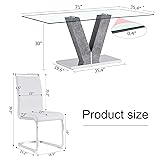 【Glass Dining Table Set for 6】: Enhance your dining experience with this elegant grey kitchen table set. Its modern, minimalist design features a clear glass tabletop and a V-shaped gray marble-textured base for an upscale, sophisticated look. Making it the perfect addition to any dining space. Pair with upholstered dining chairs for a chic and cozy dining environment. 【7PCS Modern Dining Table Set】:Table measures 71" X 35.4" X 30", providing ample space for gatherings with family and friends. Accompanied by matching dining chairs measuring 21.26 "D x 16.54 "W x 39.37 "H, this set ensures comfortable seating for everyone. Whether it's a cozy family dinner or a lively get-together with friends, our modern glass dining set creates the perfect ambiance for unforgettable dining moments together. 【Sturdy And Easy To Maintain】: Kitchen dinner tables are designed to be sturdy and durable. The glass table top is waterproof, stain-resistant and easy to clean, ensuring long-lasting beauty.The V-shaped MDF support legs and base provide excellent stability and safety. To protect your floor from scratches, the base is equipped with adjustable feet for easy movement without causing any damage. 【Comfortable Dining Chairs】:Modern dining chair made of high-quality PU fabric, waterproof and breathable, filled with high-density sponge inside, soft and comfortable sitting can effectively relieve fatigue.Built to last, the sturdy C-shaped chrome-plated metal bracket provides robust stability and can effortlessly support up to 300 pounds.