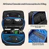 ATTENTIVE STORAGE ROOMS: Top pocket features a separate game card holder with 24 game card slots and a mesh pocket, which allow you to carry your favorite games go to anywhere; The down pocket has various slots for cell phones, wallet STAY ORGANIZED : The second compartment has various sizes pockets and a large mesh pocket, which is easy to organize all your game accessories, such as console, Dock, controllers, AC Adapter, power bank, cables; Everything has its space; And our thick velvet padding pockets can keep them from bumps and scratches LARGE CAPACITY: The third large compartment can hold your 15.6’’ laptop, keyboard and game headset; Meet all your needs for travel CARRY EASILY: Our backpack is made of tough nylon for a long-term use; Also, the ergonomic shoulder straps and breathable waist cushion can relieve your pressure on the go MULTI-OCCASION: More than a gaming carry case, our bag is also ideal for home, work, or travel; The excellent solution for your game; Our product is unrelated to brand mentioned