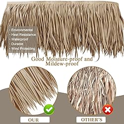 Package Include: you will receive 1 roll palm thatch roll with 15 pieces khaki cable ties, the thatch roll size measuring about 5 m/ 16.4 ft, the abundant quantity and the proper size can thoughtfully satisfy your creative ideas and decorative demands for Tiki themed parties Mexican Style Additions: for the hot summer, you can use our Mexican palm thatch runner roll to add some tropical atmosphere to your house, such as making a Tiki Palapa, bower, patio cover and so on to create the seaside scenery, or provide a commercial grade reliable natural roofing solution to your Palapa, Tiki hut, or Tiki bar Quality Materials: Tiki straw roof thatch roll is made of polymer resin material PE, this Tiki hut straw roof has a shaggy tropical thatch appearance on the top and evenly spaced knots on the underside, which will not separate into pieces easily even after exposing outside for a long time to keep their perfect appearance Easy to Install and Use: Mexican style straw roof thatch is easy to install, no complicated construction, short construction time, low cost, palm thatch runner will work well outside to serve you, you don't need to spare any time to maintain them, labor-saving and time-saving Suitable Occasions: the Tiki bar palm thatch panels can easily and widely match well with your various Hawaiian themed party decorations, to create a strong festive and happy atmosphere for your guests, and it is ideal for summer parties, tropical themed parties, Hawaiian luau celebrations and more