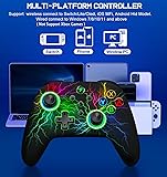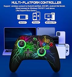 【UPGRADED FOR SWITCH 2】Allfunctions are supported for switch 2 game except “One Press Home key to Wake up the switch 2 console" and "Open voice menu". Light Up Switch Pro Controller is fully compatible with devices Switch/Switch 2/Lite/OLED, iOS MFi, Android HID Model, and wired connect Windows 7/8/10 【CUSTOM BUTTONS & ADJUSTABLE TURBO FOR ALL MUTIL-PLATFORM】With macro function key [M], ML/MR back buttons can map basic function keys of A/B/X/Y/L/ZL/R/ZR/L3/R3/D-pad to reach 1-20 combine function, to meet all your need in different game to improve game experience. Double click [SR] [SL] can temporarily open/close key function of macro function. Support Auto TURBO/Manual TURBO mode. 3 adjustable speeds: 5shots/s, 12 shots/s and 20 shots/s 【VIBRATION FUNCTION ONLY FOR SWITCH/WINDOWS PC】Built-in dual vibration motors with 3-level vibration feedback: None, Weak and Strong. which provide you excellent vibration feedback to enhance the game immersion in switch games and windows pc computer games. Press and hold L, R, ZL, ZR at the same time to cycle through the vibration intensity 【MOTION CONTROL & ONE KEY WAKE-UP ONLY FOR SWITCH】Built-in 6-axis gyro sensors provide stability and direction by sensing motion caused by vibrations, that help you make a quick response in your switch games. Support One Key Wake Up your switch console after first connection. Then next time you just simply press "HOME" key to wake up and re-connect your Switch console 【1000mAh HIGH CAPACITY BATTERY】The wireless pro controllers for switch built-in 1000mAh battery which provide more than 16 hours playing time on LED lit mode, you can enjoy longer game playing without interruption, only need 3 hours to fully charged with an included USB type c fast charging cable. Connected state, if no operation within 20 minutes, the controller automatically shut down,simply press "HOME" key to wake up and re-connect your Switch console 【WHAT YOU GET 】 It’s comfortable, and the colors and art work are just a bonus. Package list: 1X Wireless Pro Switch Controller; 1X USB Type C Charging Cable; 1X User Manual . For user support: Any question please contact our world-class, friendly support team for quick solution