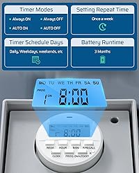 [Multiple Setting & 5 Modes] Up to 20 ON/OFF schedules for 7-day repeat cycles or a single-day setting to meet your needs; pool controller has options for Always ON/ OFF, AUTO ON/OFF, and Daylight Saving Time (DST) modes; turn it ON/OFF or change modes using the MODE button; multiple modes & day settings to save on your electric bill [Heavy Duty 40 AMP & Versatile] With 40 Amp 2HP 120/240/277 VAC, the pool pump timer control up to 2 units at once; designed for outdoor/indoor high-power appliances like pool pumps, heaters, filters, and other motor-driven equipment; giving peace of mind and convenience for managing your pool and outdoor equipment [Built-in Battery Keeps Settings] Backup battery included with 3 months available; No need to repeat settings for 7-day pool timer switch in case of power failure; hassle-free use; No more worry about losing your previous timing and settings [Weather-resistant & Durable] Waterproof resin PC housing with flame-retardant insulation resists UV & high temperatures; 2 water outlet holes prevent water from entering the junction box; pool pump timer outdoor operate from -40℉ to 140℉ for long-lasting performance; No need to turn it off or store it in bad weather [Easy Installation] Removable timer module makes simple wiring and hassle-free; heavy-duty pool timer wiring apertures in 2 sizes (1/2'' and 3/4'') to suit your needs; included wiring caps to simplify the installation process and ensure a smooth setup