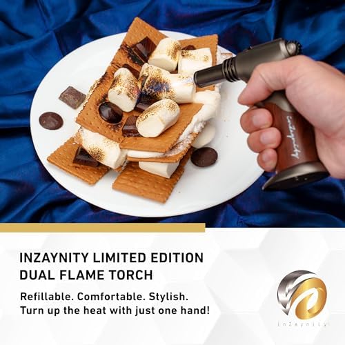 Dual Flame Butane Torch - Refillable Handheld Blow Torch for Cooking, Soldering, & Resin Art w/Adjustable Flame & Ignition Lock - Kitchen Blow Torch & Luxurious Gift Box by inZaynity - Brown Steel