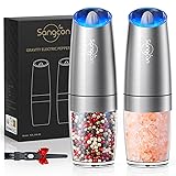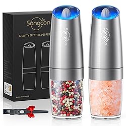 - Sangcon Gravity Electric Pepper and Salt Grinder Set Automatic Shakers Mill Grinder with LED Light, Battery Powered Adjustable Coarseness One Hand Operation, Upgraded Larger Capacity