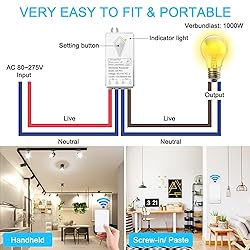 - Why Choose Nineleaf Wireless Light Switches and Receiver ? Easy to use: Our wireless switch kit powered by pressing switch panel to transmit the signal, easily design your new house decoration or old house remodel. Wireless switch:No need pulling wires to your switch location, no tearing walls, a switch can pair with a receiver, a receiver can pair with up to 8 switches. Nineleaf wire free switch works with any lights like halogen light, incandescent light, CFL light, fluorescent light, LED light, Droplight, crystal lamp, modern low-pressure lamp, absorb dome light, day flower lamp, energy-saving lamps. And can be installed in the bedroom, kitchen, living room, can also be installed in the bathroom, balcony and outdoor. Parameters: Waterproof Rating: IP 54 Switch Size: 75x48x15mm Receiver Dimension: 39x23x22mm Material: Flame Retardant PC Voltage: AC180-275V Mechanical Life: 600000 times Switch Power Supply: Maxcell CR2032 battery(included) Battery Lifespan: 330000 times 6-8 years Working Frequency: 433.92mhz Max Intergraded Load: 1000W Operating Temperature: -40~70 degree Easy to Install: Wiring: The black and white wires correspond to the lamp and the red (to power) and blue (neutral) go to the wires inside the junction box. Setting: Long press the receiver button, when the indicator light flashes, loosen your grip, then press the wireless panel switch, done. Note: 1. TO AVOID DANGER, TURN OFF ALL POWER and test the power is off before wiring! 2. Wiring: The two input wires(Red and Blue, Red wire is the Fire wire) connect to alternating current, the two output wires(Brown and Blue, Brown wire is the output Fire Wire) connect to lights or other devices.