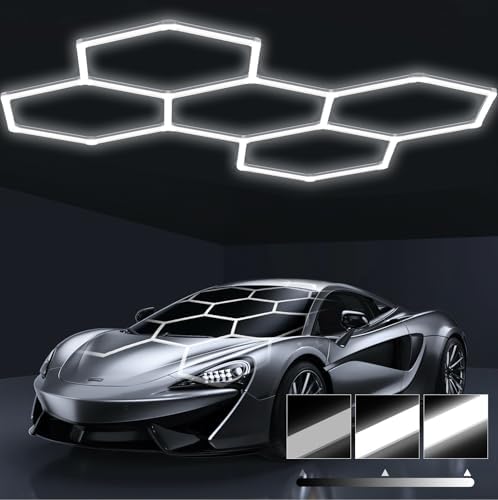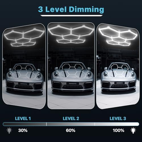 - 2024 Upgraded, 3-level Dimming: With 3 adjustable levels of brightness, you can customize the lighting to suit your needs. Whether you require bright illumination for detailed work or a softer glow for normal use, this hexagon garage light has you covered.