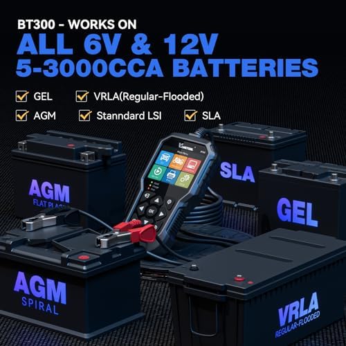 - 【WIDE COMPATIBILITY】Universal 6V/12V Battery Testing Made Simple! The BT300 battery tester automotive works with virtually any lead-acid battery (VRLA or SLA), AGM, GEL, LSI from 5-3000 CCA - perfect for car, motorcycle, truck, SUV, boat and more. Enjoy precision adjustments with flexible CCA settings (±5 or ±50) for ultra-accurate results. One 12 volt car battery tester for all your vehicles - accurate, fast & reliable! (Note: Not compatible with Lithium Battery or Golf Cart Deep Cycle Battery)