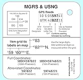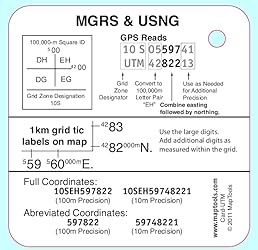 - Universal Transverse Mercator Coordinates Reference CardSample GPS display1km grid diagramExample of dividing a 1km grid into 100m squares and determining UTM in either meters or kilometersReminder that the Easting comes before the Northing Military Grid Reference System & US National GridExample GPS display in UTM showing components of MGRS/USNG coordinatesExample 100,000m square diagramExample using the “large” digits fromUTM coordinates on the map.Example MGRS/USNG coordinates. Both full and abbreviated coordinates shown with 100m and 10m precision.