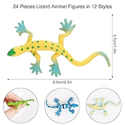 24 Pack realistic small lizards toys in 12 styles made of great safety non-toxic plastic Assorted gecko figurines measure about 2.5 inches,kids will love these cute mini lizard toys bulk Assorted colors and styles,see additional photos above to view all different types of kids lizard toys Mini fake lizard set for children,great for birthday Halloween holiday gifts to pretend play as learning resource Prefect for lizard cupcake toppers,stocking stuffing,Easter egg filler,gift bag stuffers and training children awareness of the natural world of animals