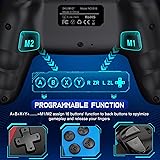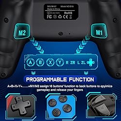 【Upgraded Switch Controller】Based before switch controllers we upgraded the wireless switch controller to compatible with Switch Console/iOS/Android/PC(Wired), greatly increasing the types of games that can be played. Switch Pro Controller supports wireless connection to play switch games, iOS MFI games(IOS 13.0 and above), Android HID games; also can be via USB wired connection with PC to support playing X-Input and Steam games.(Windows 7 and above) 【2 BACK PROGRAMMABLE BUTTONS】Switch pro controller with 2 back programming buttons, there are two modes, which are single programming or multi-programming. M1/M2= A+B+Y+L+ZL+R+ZR+D-pad, then you can use other fingers to operate more comfortably and centered. Switch controllers with the programmable buttons helping to minimize button abuse and stick clicking it can last more than several years with heavy use.(Not Support NFC Function) 【CUSTOM TURBO FUNCTION & ONE-BUTTON WAKE UP】 There are 3 adjustable speed: 5/s, 12/s or 20/s. You can customize the TURBO button, A/B/X/Y/L/ZL/R/ZR all buttons can be set to TURBO, take your game sessions up a notch with the switch Controller. Press the "Y + HOME" button to connect for the first time. Then next time just simply presses the "HOME" button of the pro switch controller to wake up your device. It's very convenient for you to start the game 【VIBRATE FUNCTION & GYRO SENSOR】 Switch controllers have dual vibration motors with 3-level precise vibration: weak, medium and strong that provide you excellent vibration feedback to enhance the game immersion. With the 6-axis gyro sensor, switch remote can detect the inclination of the controller and make a quick response, give you more fun while playing motion sensing games.( Only switch device has six-axis) 【1000MAH BATTERY CAPACITY】We've increased the switch controller’s battery capacity to 1000 mah just to provide a long time of fun. Package including a UBS-C charging cable, just charge 3 Hours for the wireless pro switch controller can provide 15 Hours, Get rid of the worry of “low battery” when you immerse in the games 【ERGONOMIC DESIGN & INCREASE WEIGHT】 The pro controller switch remote's ergonomic and non-slip design that allows you to control the game stably and don’t have to worry about the sweat in your hands. By investigating the switch gamers’ usage experience, we have increased the weight on previous switch controller, making it more comfortable to use 【DURABILITY & SUPPORT】 This switch controller has just the right amount of heft and durability so that you feel comfortable playing the Switch without feeling insecure. If you have any tech problems about this pro controller switch please let us know, we will reply to you within 24 hours and provide support for you