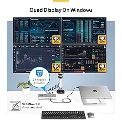 UNIVERSAL USB4 AND THUNDERBOLT DOCK : This high-performance dock offers driverless compatibility with Windows and macOS; Designed to work with Intel, Apple Silicon, AMD, Snapdragon X Copilot plus PCs, it's ideal for mixed-device fleets and laptop refreshes QUAD DISPLAY ON WINDOWS : Enables up to four 4K 60Hz monitors when connected to Windows laptops with Intel 12th Gen CPUs (or later) and DP 1.4 with DSC; Also supports triple or dual displays on older systems without DSC DUAL DISPLAY ON MAC : Get dual extended 4K 60Hz displays on MacBook Air / Pro with M3 or M4 (clamshell mode required with M3); For M1 and M2 MacBook Pro, dual extended display requires Pro or Max chip 98W POWER DELIVERY : Includes fully spec'd power adapter to simultaneously charge laptop (98W PD) and power all ports; Downstream USB 2.0 port supports 7.5W (1.5A) for charging mobile devices or other battery-powered devices THE IT PRO'S CHOICE : Our docking stations are rigorously tested in our Innovation Lab to ensure enterprise-grade reliability and cross-platform compatibility; Built to support large-scale deployments, Windows 11 upgrades, and the shift to AI-enabled PCs
