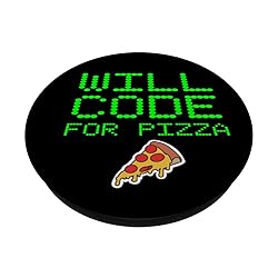 Funny design. This clever design is a must-have for computer programmers, coders, and tech enthusiasts with a love for pizza! Ideal for hackathons, coding sessions, or casual days at the office. Bring humor to the tech world with this playful "Will Code For Pizza" design, perfect for software developers, engineers, and all pizza-loving coders looking for laughs and relatable style. Adhesive backing attaches the PopGrip to your case or device. Will not stick to silicone, leather, waterproof, or highly textured cases. Works best with smooth, hard, plastic cases. Not compatible with wireless charging Printed top is swappable with other compatible PopGrip models. Just press flat, turn 90 degrees until you hear a click and remove to swap.