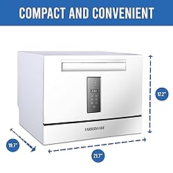 COMPACT AND PORTABLE: This mini tabletop dishwasher is great for small kitchens, apartments, RVs, and boats. Its 6-place setting capacity allows you to wash a variety of dishes up to 10" in diameter, and it includes folding-down rack shelves and a cutlery basket. VERSATILE CLEANING: Enjoy full-size dishwasher cleaning in a compact countertop unit. Seven wash programs offer Heavy, Normal, Eco, Baby Care, Glass, Speed, and Rinse, ensuring that all your dishes get thoroughly cleaned and sanitized. EXTRA-DRYING FUNCTION: This counter dishwasher machine can add extra heat to the final rinse to enhance drying results. This function is available on the Heavy, Normal, Eco, Baby Care, and Glass cycles. EASY TO USE AND MAINTAIN: This portable dishwasher features a user-friendly display and simple controls, making selecting the perfect wash cycle for your needs easy. It features a quick connect assembly, with accessories and adapters included, to easily connect directly to your sink faucet. FARBERWARE: From reliable aluminum and stainless cookware to the latest in hybrid ceramic nonstick technology, Farberware continues to bring durability, design, innovation, and value that makes it America’s most trusted cookware brand.