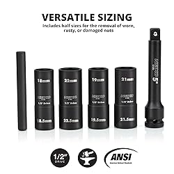 1/2 SIZE METRIC SOCKET SET: Includes half size sockets for easy removal of worn or damaged nuts with our thin wall flip impact socket set. This dual-sided socket kit has 2 sizes per socket for a total of 8 tire lug-nut sizes from 18mm to 22.5mm. HEAVY-DUTY IMPACT SOCKETS: Each socket in this lug nut impact socket set is constructed from heavy-duty chrome molybdenum steel to withstand rugged use and features a black manganese phosphate finish for a long life. DUO FLIP SOCKET: These sturdy wheel lug nut deep sockets have 2 sizes, one on each side, and are easy to flip over. They also have a thin 6-point wall construction that lets you easily reach and remove any recessed lug nuts. KNOCKOUT BAR: Flank drive for an exact fit and reduce rounding. Complete tire socket set with a 5" extension and a knockout bar to remove any stubborn bolt that may get stuck in your socket. INCLUDES: This metric socket set comes in a blow-molded case for easy transport and organization. Each socket has a highly visible laser-etched sizes: 18mm x 18.5mm, 19mm x 19.5mm, 21mm x 21.5mm, and 22mm x 22.5mm.