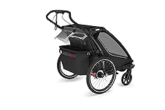 4 activities – designed to excel when you bike, jog, stroll, and ski (Jogging and Ski Kits sold separately). The included rain cover and sun canopy keep your child dry and shields them from the sun Integrated LED light powered by the Thule power bank 10k (sold separately) for better visibility in all conditions For increased control on steeper terrain and while running The modular seating ability means that you can choose to have one kid sitting in the middle, or two kids on either side of the trailer. Convenient one-hand recline and fully padded seats for on the go naps The redesigned FlipWing-system allows for even easier switching between biking and strolling and back, now with the possibility to flip the wheels up and down while the trailer is attached to the bike