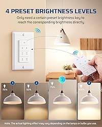 [Versatile Dimming Ways] 3 methods to control your lights: ①wall dimmer, ②remote control, ③APP control; full-range smooth dimming capabilities to easily cater to various lighting scenarios and needs, manage your lighting from anywhere, at any time. Note: The wallplate is not included. [Quick & Easy Connection] Features 2.4GHz Wi-Fi & Blue-tooth for intelligent connection; lighting control with Alexa and Google Assistant, compatible with Android and iOS; our indoor lighting dimmer can also allow for easy voice-controlled dimming [Wireless Remote Control] The dimmer and remote feature 3 button sets: ON/OFF, Smooth Dimming, and 4 Brightness Levels (Lv.1-Lv.4), intuitive design for simple operation; compatibility button on the dimmer's left side for easy integration with lighting systems [Installation Requirements] Neutral wires required, standard wall plate size, supports only single pole wiring, not 3-way; dimmer light switch is compatible with dimmable LED/CFL bulbs (max 150W) and Incandescent/Tungsten bulbs (max 400W) [Make Life Simpler] ETL certified for safety and security, this smart dimmer switch offers effortless lighting adjustments that promote energy savings while enhancing comfort and safety, especially for the elderly and individuals with limited mobility