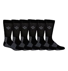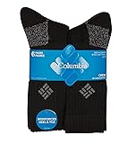 - Introducing Columbia Men's Moisture Control Crew Socks, engineered for active individuals seeking unparalleled comfort and performance. With advanced half-cushion moisture-wicking technology, these socks keep your feet dry and comfortable all day long. Experience breathability like never before with strategic mesh ventilation and arch support, ensuring optimal airflow and freshness. Crafted from a durable blend of materials including polyester, cotton, olefin, rubber, rayon, and spandex, these socks are built to withstand the rigors of daily wear. Enjoy a snug and secure fit with no slipping or bunching, providing all-day comfort and support. Plus, with the convenience of a six-pair pack, you'll have plenty of socks to keep you covered, and easy care maintenance – simply toss them in the washing machine. Elevate your sock game with Columbia Men's Moisture Control Crew Socks and enjoy unbeatable performance, comfort, and value with every step.