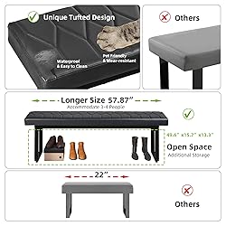 [Large Size & Scene Applications] This bench measures 57.87” L x 11.81” W x 18.89” H, making it easy to accommodate 3-4 adults. Our package includes 2pcs benches, which you can use as dining benches to match your dining table. It can also be placed in the corridor as an additional seat. It can be used as a bedside bench or a shoe bench at the door. It is also very suitable for offices and cloakrooms. It is an essential choice for you to create a fully functional room and spend a wonderful time with your family. [Comfort & Durable] The padded bench is filled with high resilience sponge, and the cushion is filled with 3.15” high rebound foam. Not easy to collapse, durable and not deformed. The bottom of the bench features metal feet to ensure excellent stability. The leather bench has a load-bearing capacity of up to 600 pounds. The surface of the extra long bench is made of PU leather fabric, which has strong breathability and is not only waterproof but also easy to clean. Simply wipe it gently with a damp cloth. Your pet can also play on it. And you can enjoy it for a long time in the future! [Color Selection] There are three colors to choose from, black is noble and elegant, and can be paired with various styles. The brown is stable and atmospheric, and it makes people feel mysterious and elegant. White is warm and pure, giving people a refreshing feeling. [Modern Style] The designer designed a unique pattern on the surface of the bench, with clear lines. The unique texture design on the surface showcases an elegant appearance and adds a sense of modernity to your home. Paired with metal black legs, it is a collision and combination of modern and industrial styles. [Easy Installation & Customer Service] This package includes labeled components and detailed instructions, making it very easy to understand. Follow the instructions for a simple assembly, which can be completed within 15 minutes. We will provide a one-year free replacement service. [Warm tips] Our fabric benches are easy to move and easy to install, making them suitable for outdoor weddings and various anniversaries. Has a sense of luxury and durability.