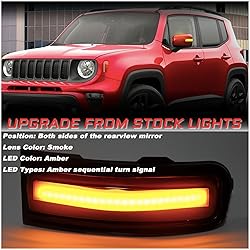 ✤【Fitment】This Dynamic Amber Side Tow Mirror Lights Compatible with Jeep Renegade Sport Latitude Limited and Trailhawk SUV 2015-2023. ✤【Function】Superior sequential led mirror signal light Turning signal direction indicator is powered by amber led diode for higher brightness and longer service life. ✤【Design】Not only beautiful but also can lead to other people's attention and increase traffic safety. ✤【Installation】Directly replace the halogen side mirror signal light of the original transparent lens. Simply remove the clear/amber reflector. And insert a new smoky lens amber side mirror led light. ✤【Product packaging】One pair Renegade Sequence led side mirrors left and right turn signals, no other accessories required.