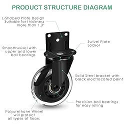 【Special Design L-shaped plate】It's good to use for the heavy table,bed,cabinets and other furnitures which is hard to turn it over. With these L- Shaped wheels, Just lift them and install the wheels. Easy and Convenient 【Heavy Duty Swivel】Made of high quality rubber with strong wear resistance,and precision sealed ball bearing for quiet and smooth operation. Each wheel can bear 150 lbs, Set of 4 can load up to 600 lbs. 【No Brake】Set of 4.This option doesn't come with brake.If you need brakes for this wheel,please choose other option. View 8T8 store,you will find more wheels with brakes. 【Smooth & No Noise】Made of Polyurethane and Steel, roll quiet and no scratch on floor, PU rubber wheel will keep quiet movement on hard wood floor without scratch,wear-resistant and no noise. 【Various Application】This heavy duty caster can be used in multi-place such as furniture tables chairs, home improvements, industrial flitting, shopping carts. Especially for heavy objects like metal shelving, Fitness Equipment,heavy cutoff saw,mobile bed tray etc. Save energy using rolling instead of carring.