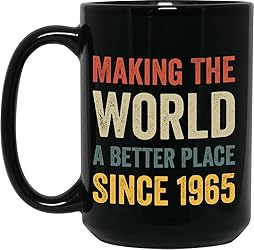 - This 1965 coffee mug says "Making the World a Better Place Since 1965." Coffee mugs make a great gift idea for men, women, parents, mom, dad, husband, wife, aunt, uncle, brother, sister, grandma, grandpa, seniors, adults, man, woman, grandmother, grandfather, coworker, boss, male, female. Perfect for any occasion, anniversary, holiday, birthday, father's day, mother's day, retirement, Christmas, Valentine's Day, Thanksgiving, and it also makes a great souvenir. High-quality ceramic coffee tea mug cup for hot or cold drinks. 100% dishwasher and microwave safe. Comes in 11 or 15 ounces.