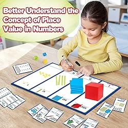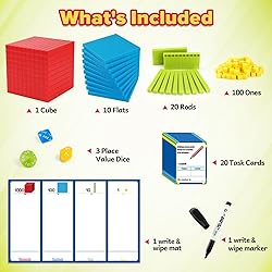 【Base Ten Blocks Set】The set included 1 write & wipe mat, 100 unit cubes (ones), 20 rods(tens), 10 flats(hundreds), and 1 cube(thousand), 1 dry erase marker, 3 place value dice, 20 double-sided task cards. 【Help Students Understand Place Value】These math manipulatives are designed to help students understand place value. They help students grasp that 10 ones make 1 ten, 10 tens make 1 hundred, and 10 hundreds make 1 thousand. They help students develop a deeper understanding of the meaning of each number concept. 【With Task Cards to Facilitate Learning】The base 10 blocks game contains 4 themes with a total of 20 cards, which can help children review their knowledge about place value by way of a math game, reinforcing their understanding in a fun and interactive way. 【Stable & Long-lasting Plastic Material】Our base ten set is made of long-lasting plastic that is easy to clean. These compact, lightweight counting blocks are easy to store and carry, and suitable for long-term use. 【Homeschool Supplies & Classroom Must Haves】This base-ten-block game is a helpful educational learning math tool for kids, perfect for use in elementary 1ST, 2ND, 3RD Grade, and kindergarten learning activities for school teachers and homeschool supplies.