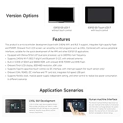 [Dual-core Processor] Equipped with Xtensa 32-bit LX7 dual-core processor, up to 240MHz main frequency [Onboard Antenna] Supports 2.4GHz Wi-Fi (802.11 b/g/n) and Bluetooth 5 (LE), with onboard antenna. Built in 512KB of SRAM and 384KB ROM, with onboard 8MB PSRAM and 8MB Flash [7inch Capacitive Touch Display] Onboard 7inch capacitive touch display, 800×480 resolution, 65K color. Supports capacitive touch control via I2C interface, 5-point touch with interrupt support [Various Peripheral Interfaces] Combined with various peripheral interfaces, suitable for the quick development of the HMI and other ESP32-S3 applications. Supports flexible clock, module power supply independent setting, and other control to realize low power consumption in different scenarios [Supports Flexible Clock] Module power supply independent setting, and other control to realize low power consumption in different scenarios