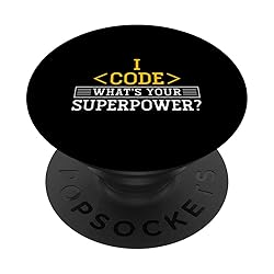 Showcases the text "I Code: What's Your Superpower?" in bold font, emphasizing the coding skills as a superpower. Perfect for coders and programmers, this tee celebrates the superhero status of those who wield the power of coding, making it a humorous and relatable choice for tech enthusiasts. Adhesive backing attaches the PopGrip to your case or device. Will not stick to silicone, leather, waterproof, or highly textured cases. Works best with smooth, hard, plastic cases. Not compatible with wireless charging Printed top is swappable with other compatible PopGrip models. Just press flat, turn 90 degrees until you hear a click and remove to swap.