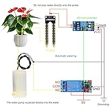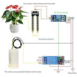 Automatic Irrigation DIY Kit: LM393 Soil Moisture Detect Sensor,Mini Water Pump, Tubing, Battery Case,One Channel 5V Relay Module and Jumper Wires in One Plant Watering System, It Can Water Plants and Flowers Automatically ,According to Monitor the Soil Moisture LM393 Soil Moisture Detect Sensor: Used LM393 Chip and Stabilizes. Operating Voltage: 3.3V to 5V; PCB Size: 32mm x 14mm/ 1.26 inch x 0.55 inch; Equipped with a Fixed Bolt Hole that is Easy to Install 1 Channel 5V Relay Module: Maximum Load: AC 250V/10A, DC 30V/10A; Operating Voltage 12V; Power Indicator (Green), Relay Status Indicator (Red) Mini Water Pump: Rated Voltage: DC 3V or 4.5V; No Load of Water Discharge Capacity: 100L / H ; Load Rated Current: 0.18A; Use: Diving Type Wide Application: This Submersible Pump Can be Used for Small Size Aquarium, Fish Tank, Pond, Tabletop Fountains, Water Gardens and Hydroponic Systems