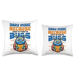 100% Polyester Funny debugger design to work long hours of solving code puzzles. Great code debugging and programmer motif. Dark Mode Because Light Attracts Bugs. 100% spun-polyester fabric Double-sided print Filled with 100% polyester and sewn closed Individually cut and sewn by hand Spot clean/dry clean only
