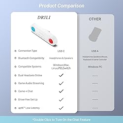 EASY CHAT ACTIVATION FOR PS5/4: Enjoy seamless communication during your gaming sessions by manually activating the MIC function. To enable it on PS5/4, just double-click the A/B button corresponding to the headset on the adapter. This easy method will ensure you're ready to chat with your fellow gamers. NO LAG AUDIO: The wireless audio dongle is designed to eliminate the frustrating Bluetooth audio lag issue. With aptX Low Latency compatibility, when paired with a Bluetooth headphone or speaker that also supports aptX-LL, you'll experience minimal audio delay. The audio lag is significantly reduced to less than 40ms (220ms for standard Bluetooth) PLUG AND PLAY CONVENIENCE: Enhance your audio capabilities effortlessly with the Bluetooth audio adapter. No need to install any drivers/software. Add Bluetooth audio capability (AUDIO devices ONLY, no data) with ease to your PS5, PS4, Switch, Desktop or iMac, Linux or Chromebook. PRIVACY GAMING TIME: Indulge in late-night gaming sessions without disturbing your family or roommates. Stream audio from your PS5, PS4 or Switch into your Bluetooth headsets so you can enjoy your late-night gaming session without disturbing your family or roommates. PC & MAC COMPATIBLE: DRILI Bluetooth audio adapter is not limited to gaming. It's also a versatile tool for your work-from-home setup. It's also perfect for conference calls, meetings, Skype, Zoom, Teams, Meet & more. The adapter seamlessly switches between Music and Talk modes when used on a Windows PC, ensuring optimal audio quality whether you're immersed in work or play.
