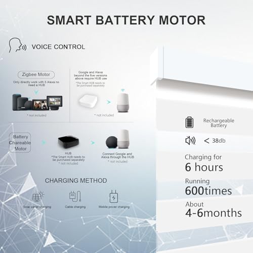 - 【Note】 Motor A (RF Battery Motor) doesn't include a HUB. It's an RF motor for remote control only. To connect with Alexa and Google smart speakers, a separate hub is required, priced at $29. To link with Alexa and Google devices, add the Smart RF HUB to your order. If your device fits the types(Echo Studio, Echo 4th Gen, Echo Plus 2nd Gen, Echo Show 2nd Gen, Echo Show 10)you can consider Motor B (Zigbee Smart Motor). If you only need remote control without smart device linking, ignore this.