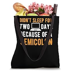 Do you love to write codes? Best gift idea with a quote "Didn't Sleep For Two Days Because Of A Semicolon" for programmers and software developers. Cute present for computer lovers and fans who loves to use HTML and JavaScript 16” x 16” bag with two 14” long and 1” wide black cotton webbing strap handles. Made of a lightweight, spun polyester canvas-like fabric. All seams and stress points are double-stitched for durability, and the reinforced bottom flattens to fit more items and hold larger objects. Spot clean/dry clean only.
