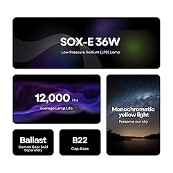 Energy Efficient and Durable: This Low Pressure Sodium (LPS) light provides exceptional energy efficiency and long-lasting performance, reducing replacement frequency and energy costs. Versatile Applications: Ideal for Thomas duplex safelights, darkroom safelights, studios, theaters, and outdoor lighting, including parking lots, public streets, highways, airports, and bridge underpasses. Monochromatic Yellow Light: Emits a warm yellow monochromatic light that minimizes environmental disturbance, preserves the night sky, and provides an ambient, low-CRI glow for various uses. Philips SOX Replacement: A perfect replacement for the Philips Low Pressure Sodium Lamp Master SOX-E 36W, ensuring compatibility and reliable performance for existing setups. Specialized Use Cases: Commonly used in black fire experiments, black flame experiments, sky preservation, streetlights, garden lights, and other scientific or aesthetic applications requiring one-color, uniform lighting.