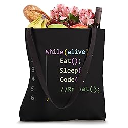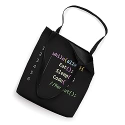 "Eat Sleep Code Repeat" This is a funny developer saying for programmer who is your friend, girlfriend, mom, dad, son, daughter, father, mother, brother, sister, uncle... Great for everyone loves programming languages humor, java, javascript, html, php... Are you looking for a surprise for computer programmer? Grab this "Eat() Sleep() Code() Repeat()" developer outfit for web developer, software developer, game developer, website developer, app developer, front end, back end or full stack developer... 16” x 16” bag with two 14” long and 1” wide black cotton webbing strap handles. Made of a lightweight, spun polyester canvas-like fabric. All seams and stress points are double-stitched for durability, and the reinforced bottom flattens to fit more items and hold larger objects. Spot clean/dry clean only.