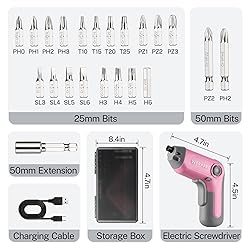 Package Contents: Set includes 1PC electric screwdriver, 1PC USB cable, 1PC carrying case, 1PC 50mm extension rod, 2PCS 50mm bits (PH2/PZ2) and 19PCS 25mm bits (PH0/1/2/3, PZ1/2/3, H1/8, 5/32, 3/16, 1/4, T10/15/20/25, SL1/8, 5/32, 3/16, 1/4) Offset Design: Compared with other center driving products, this cordless screw driver with offset driving shaft has a wider range of uses. It is very suitable for precise work on edges and corners, providing more flexibility and and making your work more convenient High-efficiency Charge: This power screwdriver supports USB A to C and USB C to C charging. Just connect it to a power bank, charger, laptop, etc., it can be fully charged in 1.5-2 hours with light indication — red: charging, green: fully charged Unique design: The front LED light with automatic on and off function ensures that you can see clearly even when working in a dimly lit environment, improving the safety of operation; a lightweight storage box keeps the bits neatly organized, making it ideal to carry and store Excellent Performance: Despite its compact size, this rechargeable automatic screw gun has impressive performance. With a torque of up to 5NM and a top speed of 210RPM, it is ideal for tasks such as assembling furniture, installing fixtures, and general repairs From October 1, 2025 to September 31, 2026, your purchase of this product will result in a minimum donation of $15,000 to be donated to Helping Women Now. Reminder: To maintain battery health, please recharge every 3-6 months if not in use, and avoid leaving the battery fully discharged for long periods