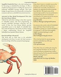 - Simplified Embedded Rust is the ideal starting point in a transformative journey to become an embedded Rust developer.Simplified Embedded Rustoffers a seamless learning experience avoiding the intricacies of traditional embedded learning methods. Simplified Embedded Rust bridges the gap between the dynamically evolving Rust ecosystem and scarce embedded educational resources. Hassle-Free LearningNo hardware acquisition, no component acquisition, no wiring pain, and no toolchain setup. Easy and accessible learning from anywhere. All you need is a copy of Simplified Embedded Rust and a computer. Book ContentsIntroduction to Embedded SystemsMicrocontroller ConceptsEmbedded Rust & ESPsProgramming Embedded ApplicationsProgramming GPIOProgramming ADCsProgramming Timers & CountersProgramming PWMProgramming Serial CommunicationThe Embassy Framework What You Will Get10 Chapters with a total of 200+ pages.14 full pre-wired code examples covering standard microcontroller peripherals.Questions and exercises with pre-wired examples.Source Code is all Publicly Available on GitHub.Rust Knowledge is Required!The book aims to teach how to do embedded development with Rust. As such, the book assumes a certain knowledge of the Rust programming language. Basic knowledge of Rust should be sufficient. Ideally, one would be familiar with topics up to chapter 10 of “The Book.”Interested in Embedded Rust Bare Metal Development? Dive into the Core Library EditionTailored for individuals looking to fuse their expertise in embedded systems with Rust programming, or seasoned embedded developers venturing into the world of Rust, the Core Library Edition provides unparalleled access to the depths of embedded Rust bare-metal development. Also perfect for those seeking a deeper understanding beyond the Simplified Embedded Rust Standard Library Edition.