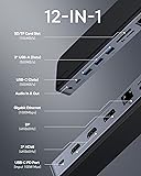 12-in-1 All-in-One Expansion: Equipped with 3 USB-A 3.0 ports, 1 USB-C 3.0 port, Gigabit Ethernet, 4K HDMI, 4K DP, TF/SD card readers, audio jack,100W PD charging port — everything you need for seamless connectivity in one compact docking station 3 monitors Triple 4K Display Support: Connect both HDMI and DP displays to enjoy ultra-clear 4K resolution on 3 monitors, usb docking station is perfect for multitasking, creative work, or immersive entertainment Gigabit Ethernet for Stable Speed: Stay connected with the built-in Gigabit Ethernet port, usb c dock offer fast and reliable wired internet—ideal for video calls, large downloads, and stable online work 100W PD Fast Charging: The usb c docking station's PD port supports up to 100W input and delivers up to 85W output to your laptop, ensuring fast, efficient charging while you work Ergonomic Stand Design: Innovative stand design improves heat dissipation, elevates your device for better posture, and keeps your workspace clean and organized
