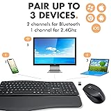 BACKLIT FOR ANY SITUATION – The backlit wireless keyboard mouse combo includes 3 brightness levels, making it easy to work in bright or dim environments. Perfect for late-night typing or shared office spaces. SEAMLESS MULTI-DEVICE CONNECTIVITY – Easily switch between laptop, desktop, or tablet with a bluetooth mouse and keyboard combo that supports 3 channels (2 Bluetooth, 1 USB 2.4G). Ideal for flexible work across devices. ERGONOMIC COMFORT FOR ALL-DAY USE – Designed for natural typing posture, this ergonomic keyboard and mouse wireless combo features a curved wave keyboard with detachable palm rest and a contoured mouse that fits perfectly in your hand. SMOOTH, PRECISE CONTROL – Navigate with accuracy using a wave keyboard and mouse wireless combo that offers 4 DPI settings (800/1200/1600/2400) plus forward/back buttons for faster browsing and workflow efficiency. RECHARGEABLE & ECO-FRIENDLY POWER – A rechargeable wireless keyboard and mouse with built-in batteries keeps your workspace powered without disposable batteries, reducing clutter and saving money over time. PERFECT GIFT FOR PRODUCTIVITY – Sleek, modern, and practical, this keyboard and mouse wireless set makes a thoughtful holiday, birthday, or new job gift, ideal for students, professionals, and home office upgrades.