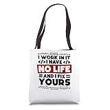 I Work In It I Have No Life, And I Fix Yours Great computer science design for men and women programmer coder. If you are searching for computer engineer or programming coding this is for you. 16” x 16” bag with two 14” long and 1” wide black cotton webbing strap handles. Made of a lightweight, spun polyester canvas-like fabric. All seams and stress points are double-stitched for durability, and the reinforced bottom flattens to fit more items and hold larger objects. Spot clean/dry clean only.