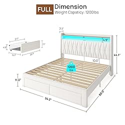 Multi-Function RGB LED Light: Elevate your living space with the RGB LED light strip integrated into the bed frame. Customize colors, brightness, modes, and timing functions effortlessly using the mobile app. Follow the detailed instructions for easy setup, enabling you to create a vibrant and personalized ambiance for any style or occasion Headboard with Charging Station: The headboard features a built-in charging station with 2 USB ports and 1 Type C power strip. Keep your devices powered up conveniently, without worrying about low battery, making it easy to charge your tablet, phone, or other mobile devices Ample Storage Space: The headboard features two-tier storage shelves, perfect for keeping small items like phones, glasses, and books within easy reach. Additionally, the under-bed storage space provides ample room for your daily storage needs, ensuring a neat and organized appearance. The inclusion of drawers with wheels makes it easy to store clothes or bedding, maximizing space utilization without compromising on organization Upholstered Design Modern Bed: Featuring classical off white lambswool upholstery that is skin-friendly, breathable, and wear-resistant, this bed adds a sophisticated touch to any bedroom. Combining elegance with functionality, this upholstered bed frame is perfect for modern bedrooms Noise-Free & Easy to Assemble: The solid stainless steel frame and wood slats ensure durability and stability. With illustrated instructions, numbered parts, and all necessary tools included, assembly is straightforward and doesn't require professional skills, offering a hassle-free setup experience. With a generous weight capacity of 1200 lbs. Frame made of FSC-Certified wood