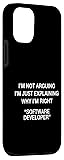 I'm Not Arguing I'm Just Explaining Why I'm Right Software Developer - Great for a programmer, coder, or software developer who designs software using codes to fulfill the demands of users. Ideal for someone who works in the field of computer systems. Ideal treat for a software engineer, developer, or web developer. Perfect for a computer programmer, application developer, or computer specialist. This is a wonderful design to show off your programming skills on Programmers Day. Two-part protective case made from a premium scratch-resistant polycarbonate shell and shock absorbent TPU liner protects against drops Printed in the USA Easy installation