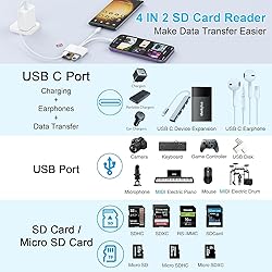 📷【Type-C/iPhone SD Card Reader】Equipped with dual USB C and lightning ports, the card reader for iphone is compatible with devices with Type-C and iPhone ports, which doubles the compatibility of ordinary card readers, making it a great companion for all photography enthusiasts. 📷【3-in-1 USB Type-C Port】The USB C port (with charging/headphone/data icon) of the memory card reader for iphone is multi-functional port, supporting three functions of fast charging/audio output/high-speed data transfer, you can use it to charge your mobile phone or listen to music, or even for data transfer, full of to meet your multiple needs. 📷【High-Speed bi-directional Data Transfer】The sd card reader iphone has a built-in USB3.0 and MFI certified chip that supports USB3.0 high-speed data transfer, transferring 300 photos in just a few seconds. The sd card reader for ipad also supports bi-directional data transfer before SD/MicroSD/U disk and mobile phone, sharing happy moments anytime, anywhere. 📷【Plug-and-Play & Simultaneous Reading and Writing】The sd card reader for iphone usb c does not require installation of third-party software, no wifi, plug and play, and can be easily used by the elderly in time. The iphone card reader also supports reading and writing two USB flash drives and one memory card at the same time, which saves data transfer time. 📷【Universal Compatibility】This iphone sd card reader adapter features devices such as smartphones and pad with USB-C and iPhone ports. lightning sd card reader is suitable for iPhone 14/13/12/11/8/7/6/Plus/Pro/Pro Max/XR/X/XS, iPad/mini/Air. USB C to sd card reader is suitable for iPhone 15 series, Samsung Galaxy S10 S9 Note 9 8, LG G5 G6 V20 etc. 📷【After-Sales Guarantee】The iPad sd card reader is compact, portable and durable, the cable leaves more space for other ports .We also provide professional technical support to keeping your SD Card Reader for iPhone always performing at its peak