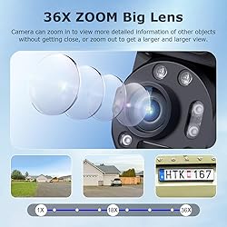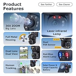 【4G LTE Cellular CCTV Camera for Home】This security camera operates on a 4G-LTE network, with a provided 4G LTE SIM card, eliminating the dependency on WiFi connections. Ideal for remote or wifi-inaccessible areas like agricultural land, construction zones, holiday properties, or storage facilities, this 3G/4G LTE camera ensures surveillance where traditional internet service is unavailable. 【36X Optical Zoom Dual 】Solar camera with Lens①:2.8mm,Lens②:4.9+47.04mm big lens,allows you to clearly zoom in on distant objects(license plate number can see).In the UBOX app, you can see that the dual lens is divided into two screens 【10W Solar Panels and 20000mA Battery】This cordless camera comes with a 10-watt solar panel that efficiently captures and converts solar power. It also features a substantial 20,000mAh battery, allowing extended operation. Even in the absence of sunlight, the camera can function autonomously for up to three months. 【Separate Installation】The solar-powered camera offers a modular installation setup. This clever configuration allows for the camera to be mounted in the perfect spot for monitoring, while the solar panel can be situated in an area with maximum sun exposure to ensure it captures sufficient solar energy. 【Best Night Vision】Night vision range of up to 328FT and day-time visibility extending to an impressive 650FT. Outshine the competition with our powerful dual spotlights, casting bright illumination across 65ft, ensuring your property remains secure around the clock.