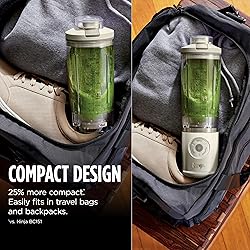 BLEND, TWIST & GO: Detachable base is the first of its kind for ultimate portability. Powerfully blend, twist and take your smoothie on-the-go virtually anywhere. NINJA BLENDING POWER: Unlock the power and performance of a corded blender*, now cord free with Ninja Powerblast Technology. Crush through frozen ingredients and ice from anywhere. *versus Oster (BLSTMEG-G00-000) DETACHABLE VESSEL: Exclusive Twist & Go blending vessel can detach from the motor base with one twist and is 50% lighter* than those with motor bases attached. *versus Ninja BC151 THREE INTELIGENT PROGRAMS: 3 Auto IQ preset functions unlock versatility on the go. Smoothie, crush, & blend programs deliver perfect results at the touch of a button. Dedicated power button means no accidental blends. XL BLENDING CAPACITY: Create up to 22 oz. of your favorite smoothies, frozen drinks, protein shakes, and more. SIP LID AND SILICONE HANDLE: Drink directly from the vessel with the integrated sip lid and easily carry on the go with a built-in silicone handle. BATTERY LIFE INDICATOR: Provides a real-time reading on when a charge is needed—no more guessing when you need to charge. RECHARGEABLE BASE: Get the most blending runtime of any cordless blender. A full charge takes approximately 3 hours. EASY TO CLEAN: Lid and vessel with built-in Crushblade are top-rack dishwasher safe. The blender can also self-clean with one blend cycle using water and a drop of dish soap. WHAT'S INCLUDED: 11.1V rechargeable motor base, 22oz. Twist & Go vessel with built-in CrushBlade, Easy-Open Sip Lid with Carrying handle, Charging Cable, 5-recipe Inspiration Guide.
