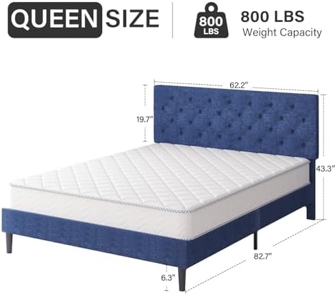- 【Comfortable& Soft】: This queen size bed frame with headboard is designed with classic linen fabric and high dense foam, which bring a feeling of comfortable and relaxing to you. And also blue queen bed frame provide a soft lean on space